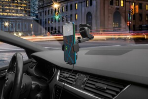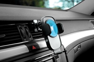 Držák umožňuje bezdrátově nabíjet moderní telefony výkonem až 15W,
